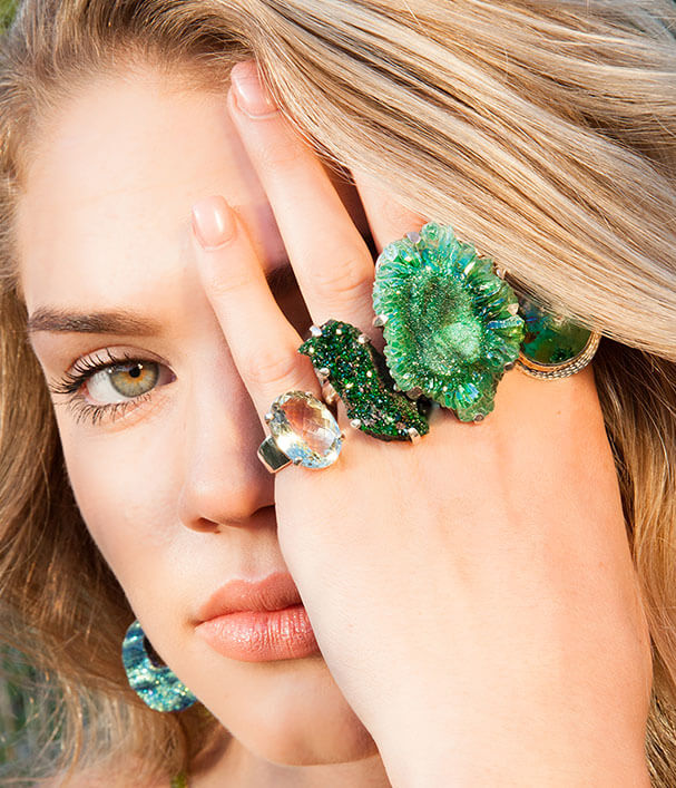 Wir lassen uns ständig von der natürlichen Schönheit von Fossilien, Edelsteinen, Kristallen und Mineralien inspirieren. Wir beziehen sie direkt aus den Minen und reisen viel in die entlegensten Teile der Welt, um Schmuck zu schaffen, der die innewohnende Schönheit natürlicher Edelsteine zum Vorschein bringt und sie in einem anderen Kontext und Licht erstrahlen lässt.