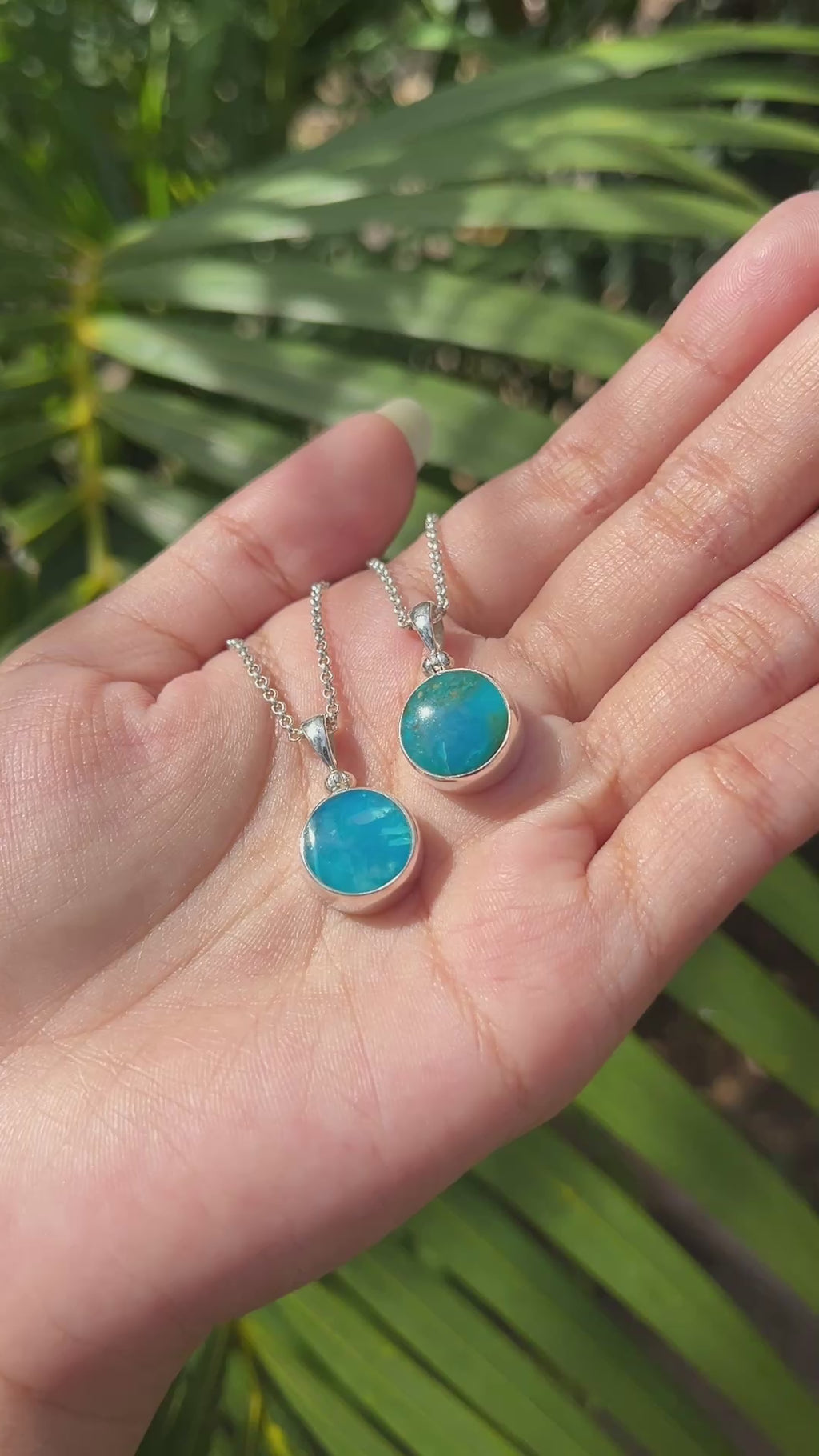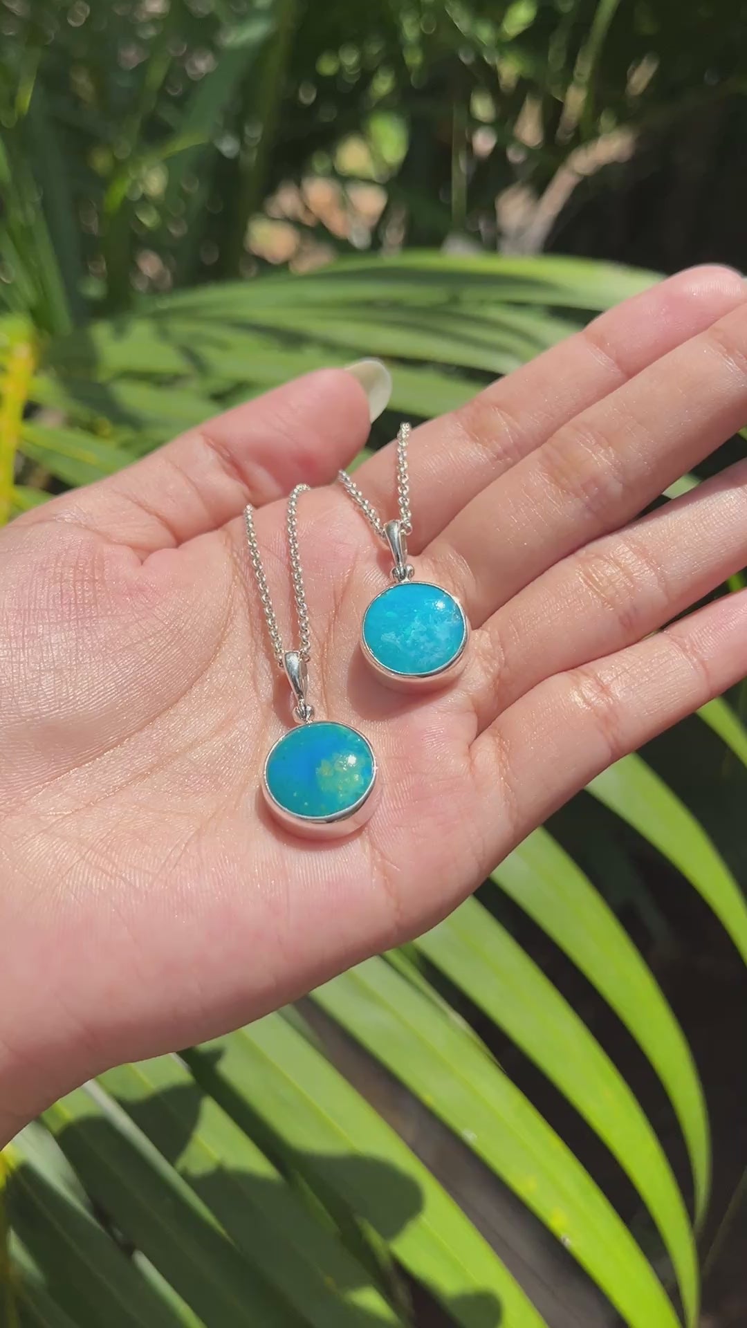 - Vivid Peruvian Blue Opal pendant, elegantly bezel-set in fine sterling silver. Available in two sizes, ranging from approximately 0.95 to 1.05 inches in length.